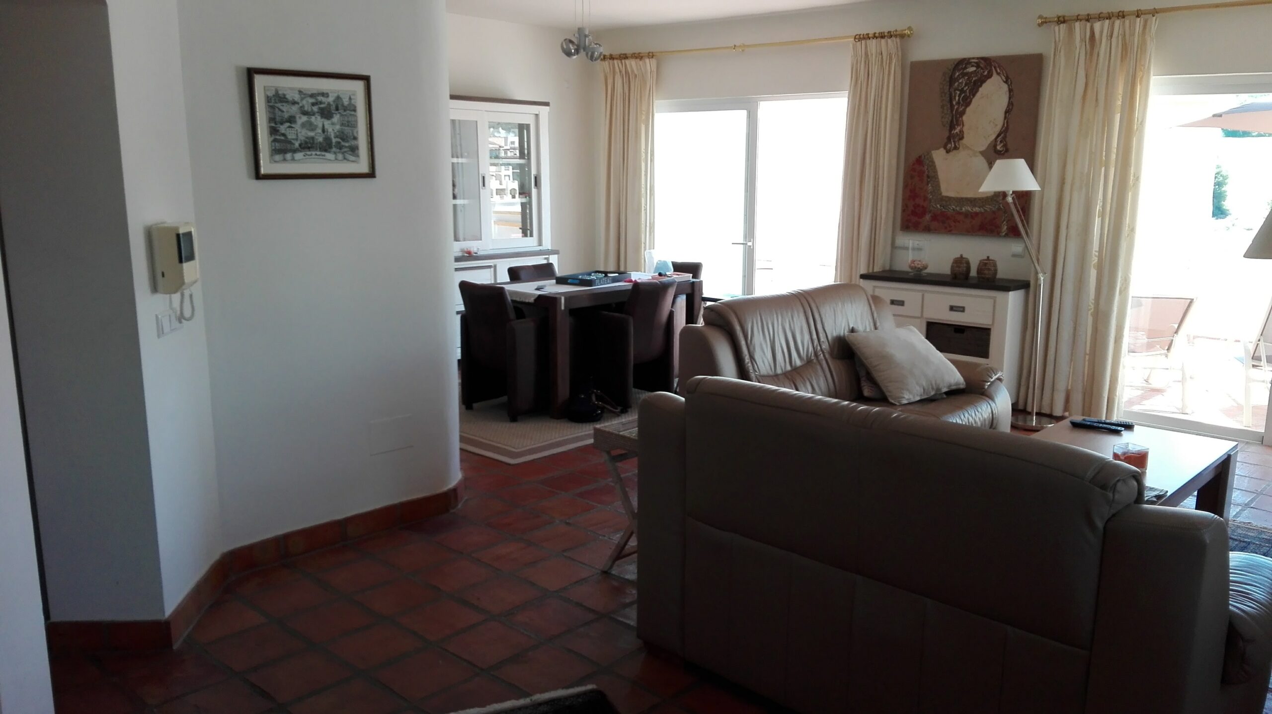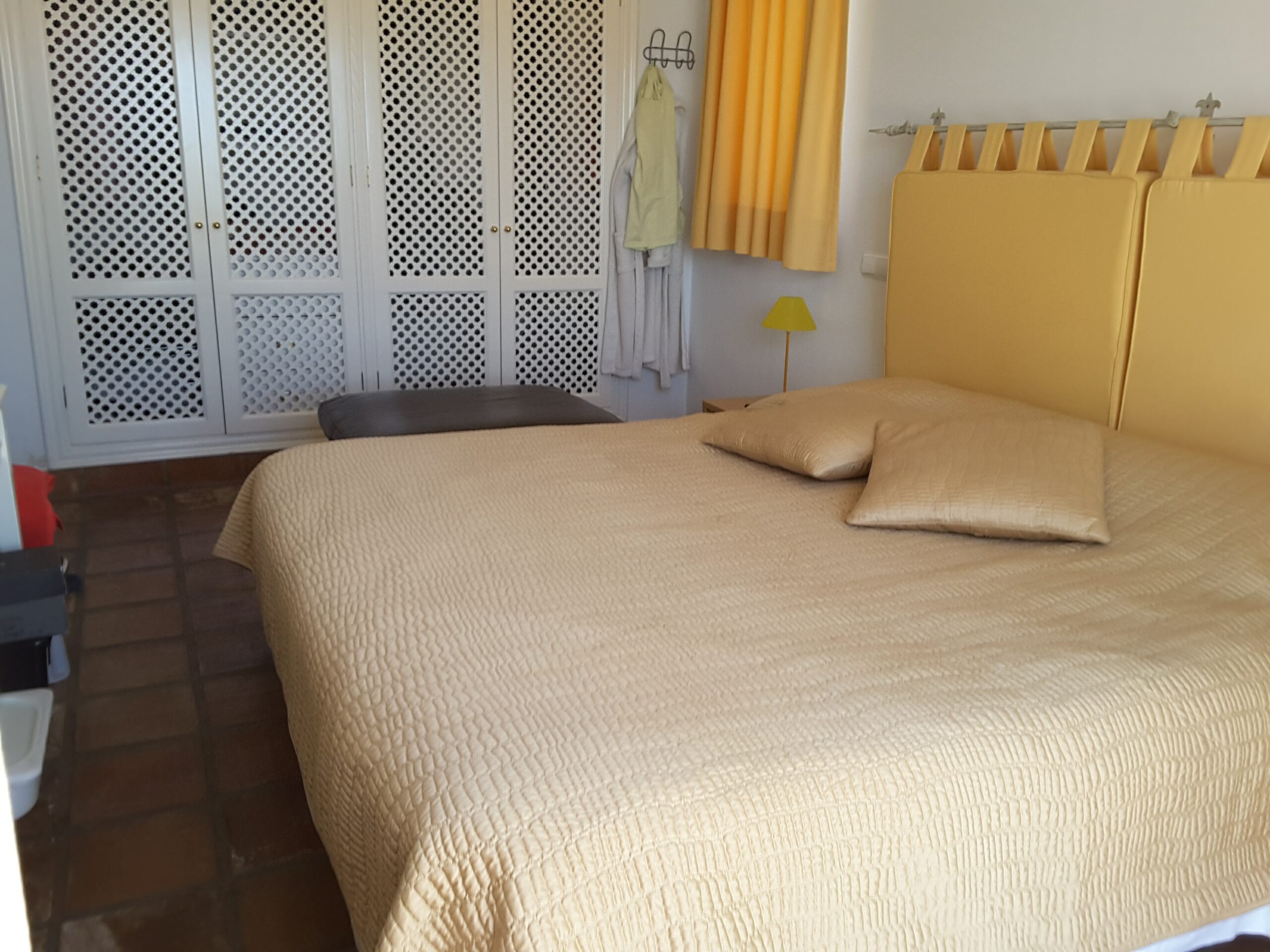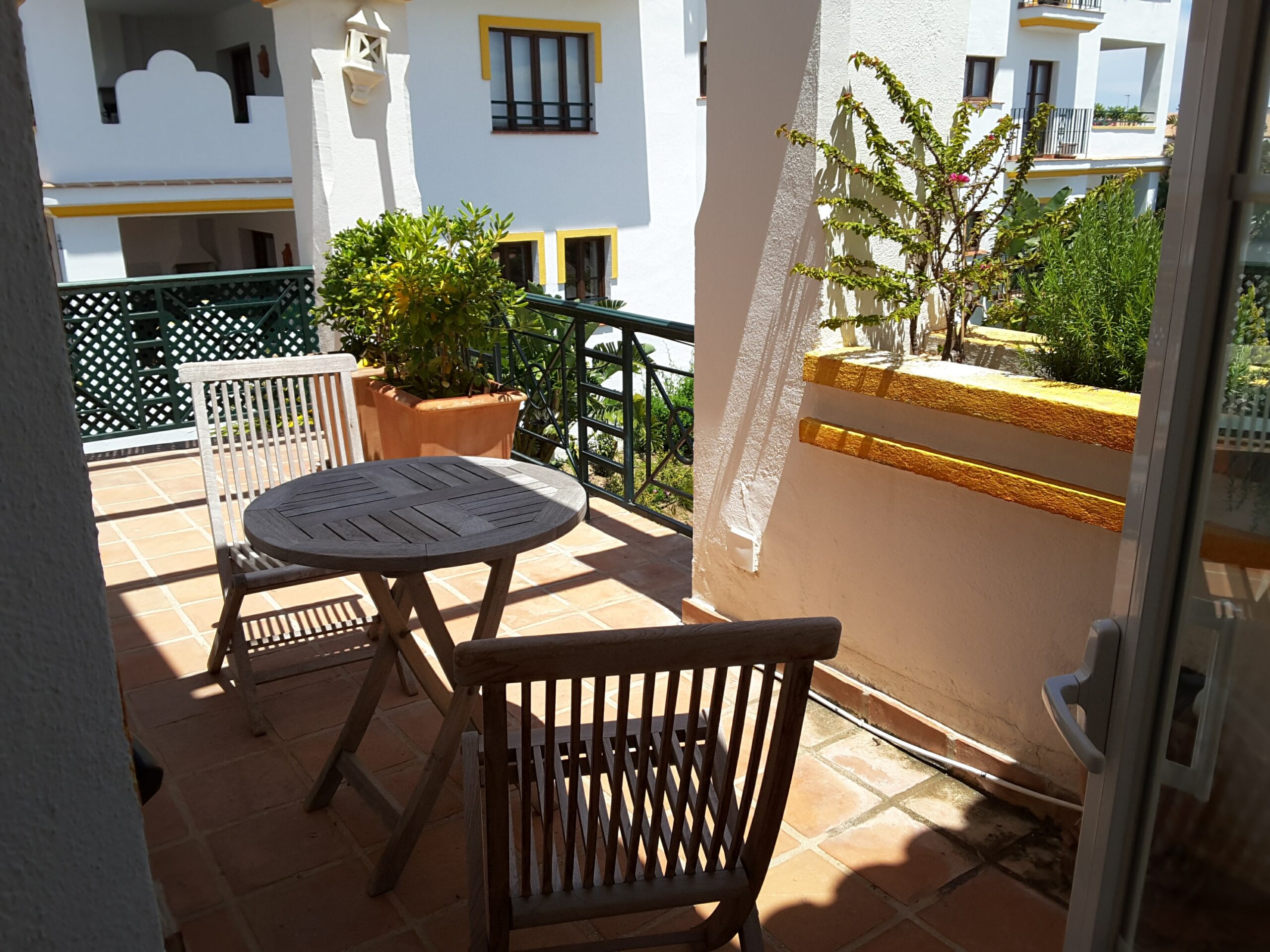 Appartement met 2 slaapkamers en 2 badkamers, op de eerste verdieping. West en Oost georiënteerd. Volledig gemeubeld. 1 ruim overdekt terras met uitzicht op zee en 1 groot, deels overdekt terras met uitzicht op de golfbaan, tuin en zwembad.