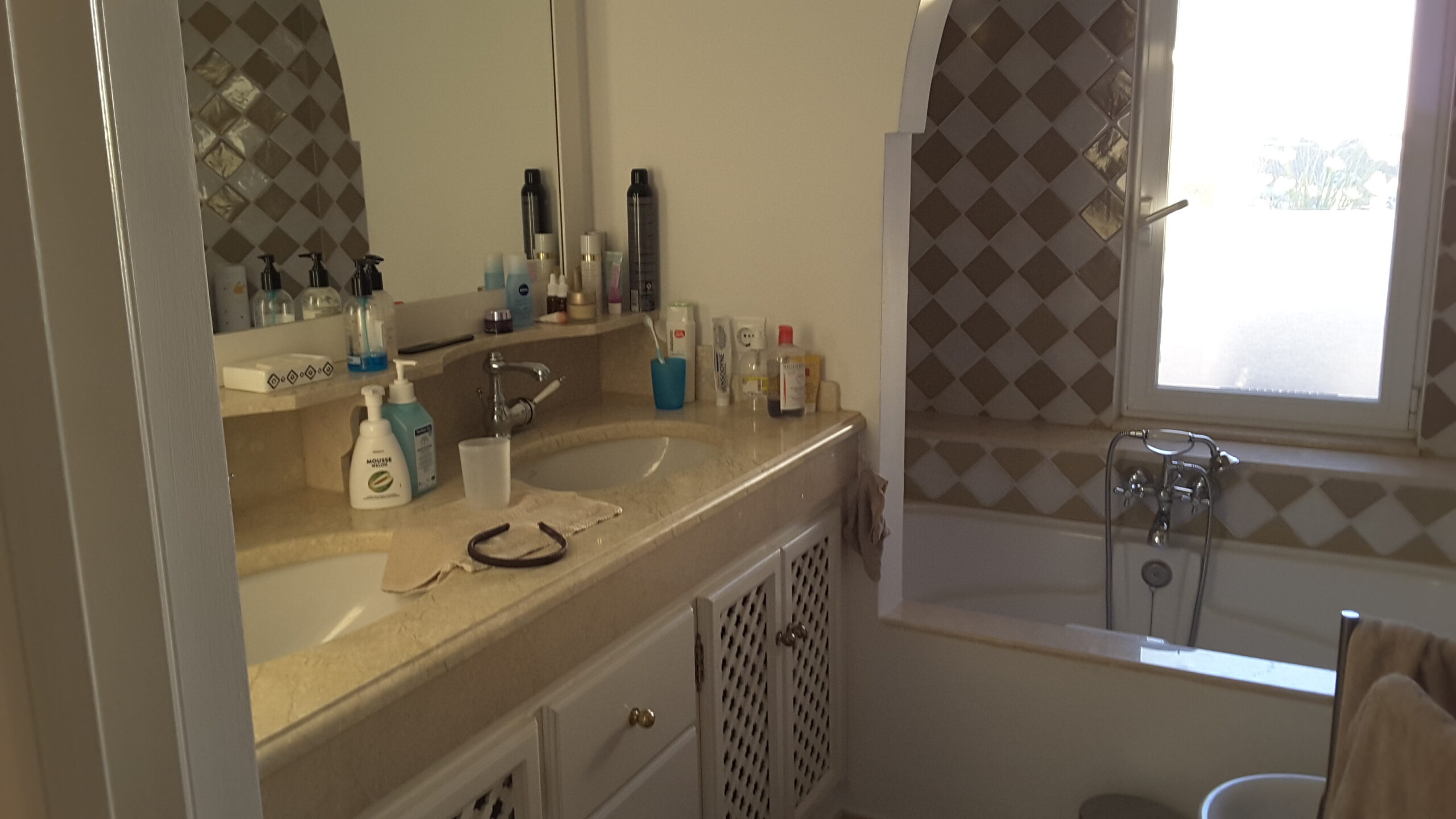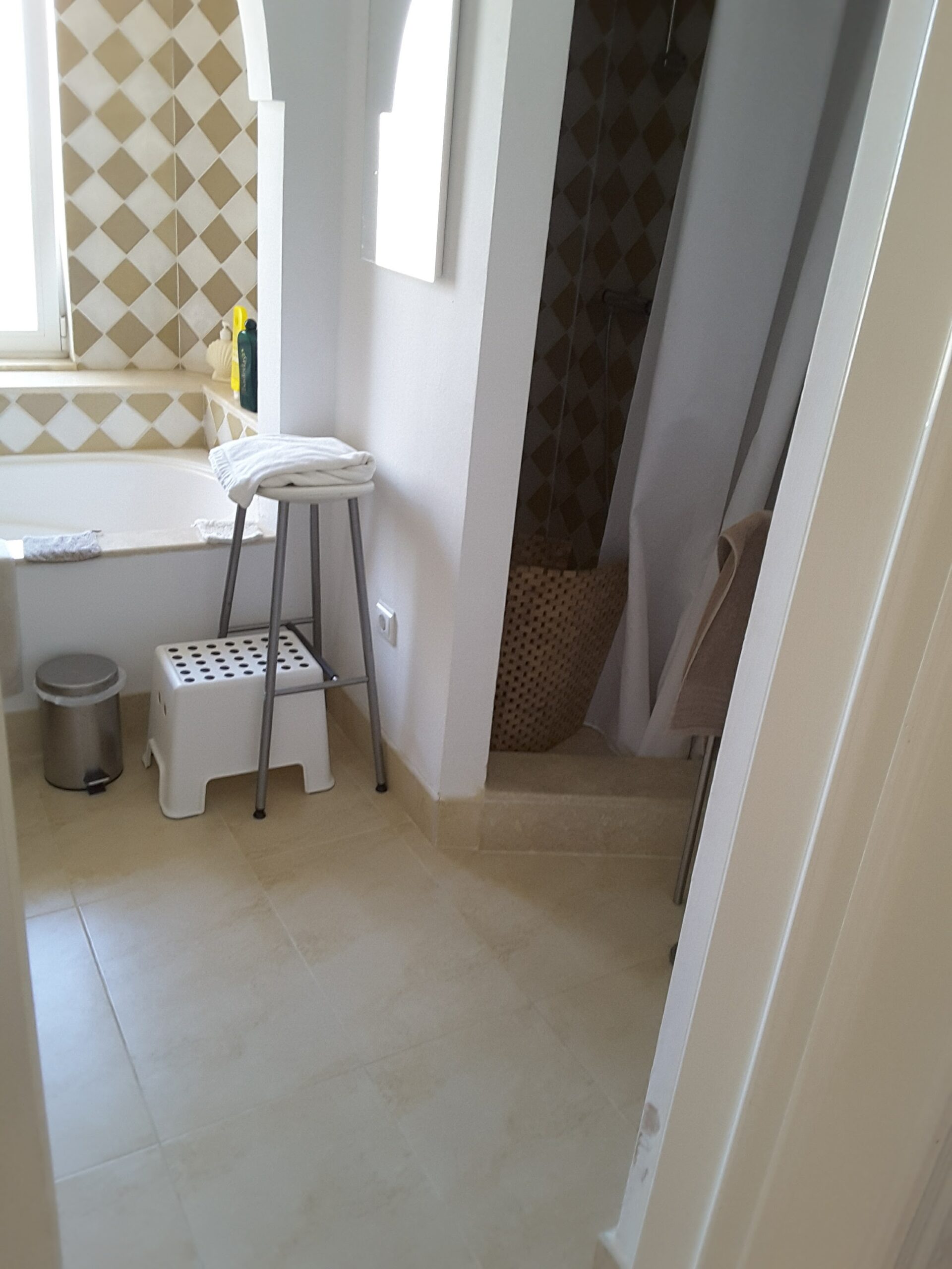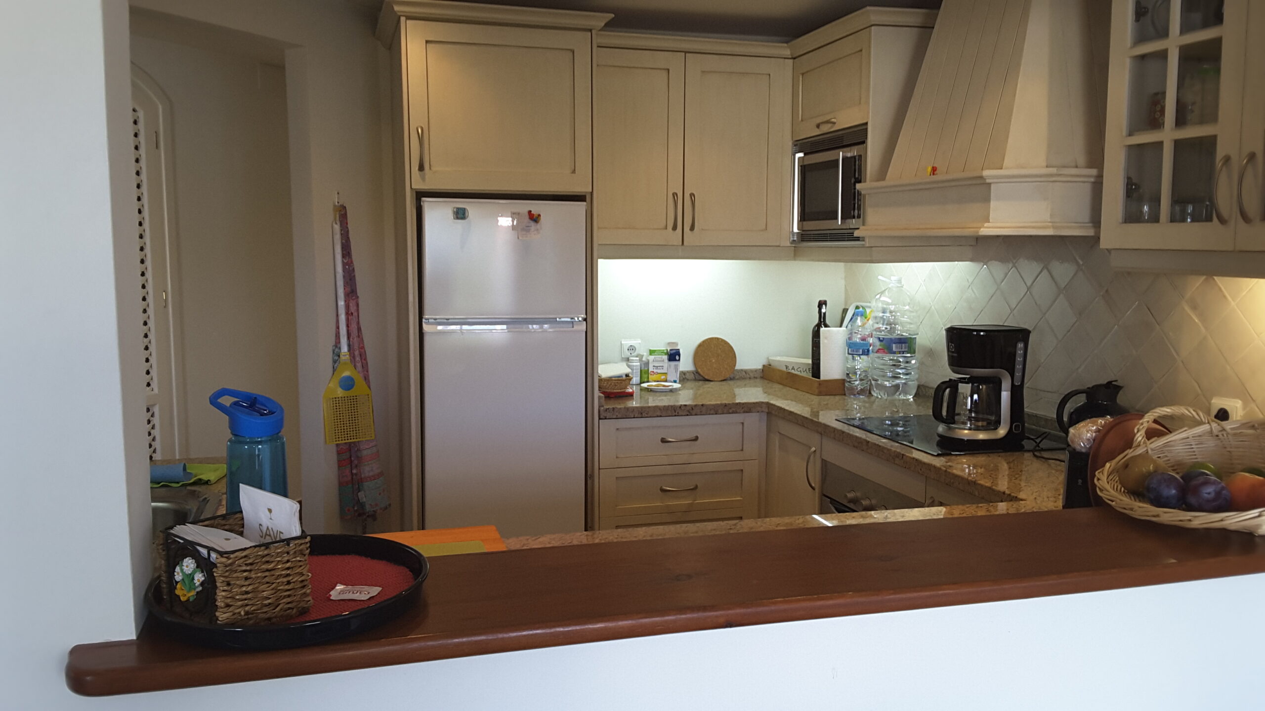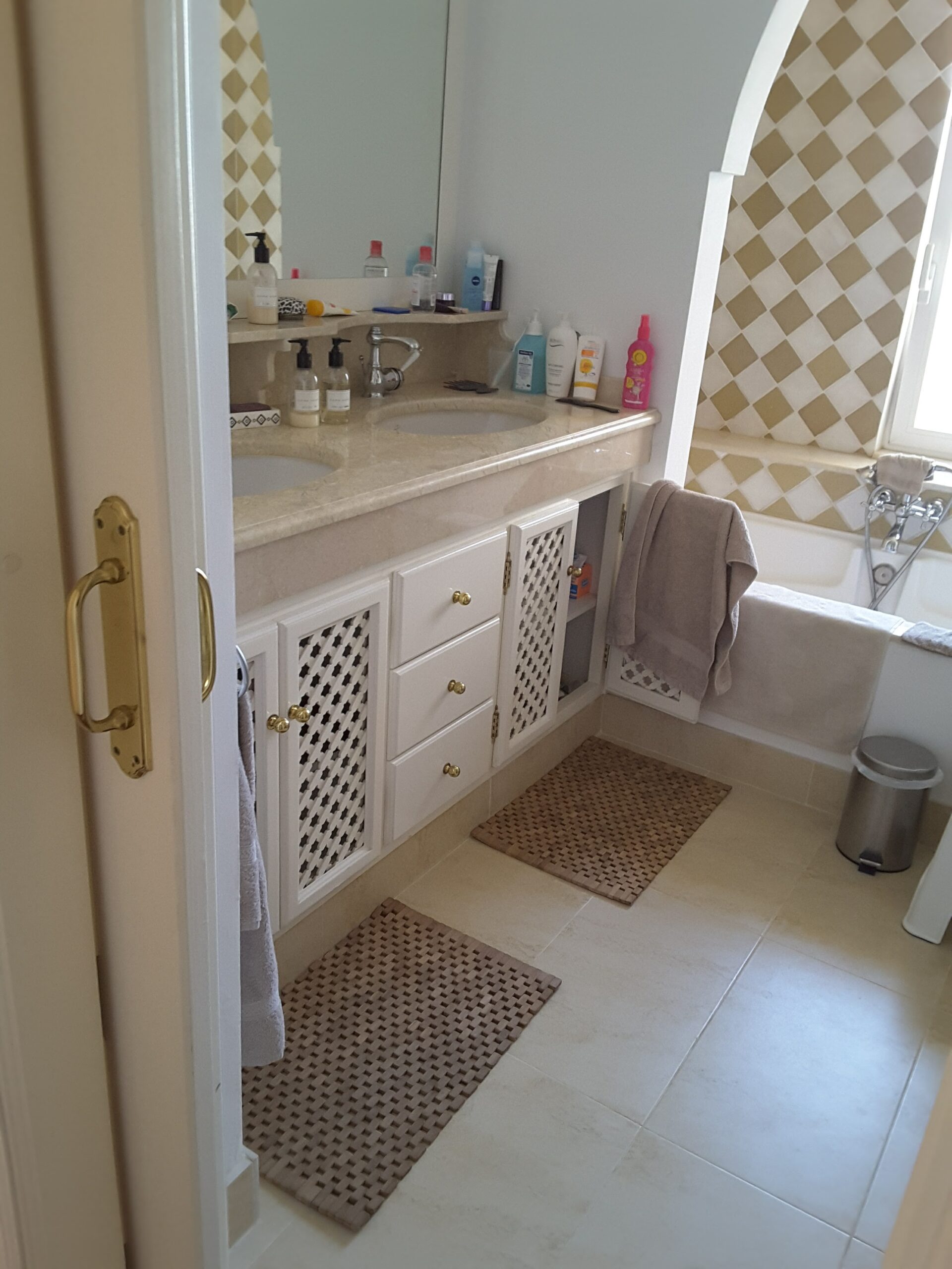 Appartement met 2 slaapkamers en 2 badkamers, op de eerste verdieping. West en Oost georiënteerd. Volledig gemeubeld. 1 ruim overdekt terras met uitzicht op zee en 1 groot, deels overdekt terras met uitzicht op de golfbaan, tuin en zwembad.